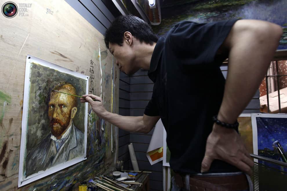 Dutch artist Van Gogh was most famously known for works of art such as 向日葵(xiàng rì kuí): ‘Vase with Twelve Sunflowers’ and 星夜 (xīng yè): ‘The Starry Night’ and is a favourite of reproduction artists in Da Fen.