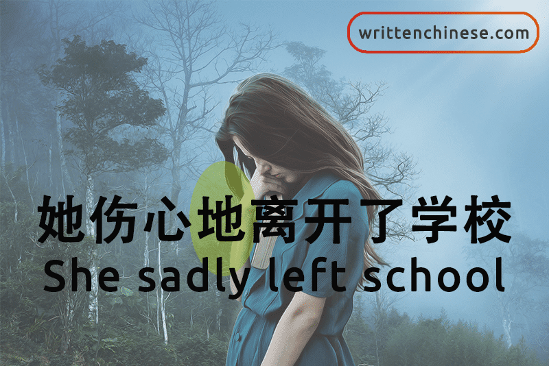 她伤心地离开了学校。(tā shāng xīn de lí kāi le xué xiào.) She sadly left school.