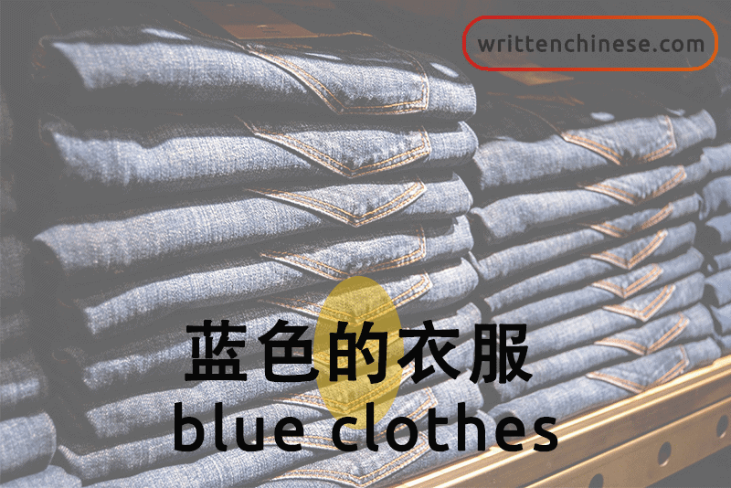 蓝色的衣服。 (lán sè de yī fu) blue clothes (the clothes are blue)