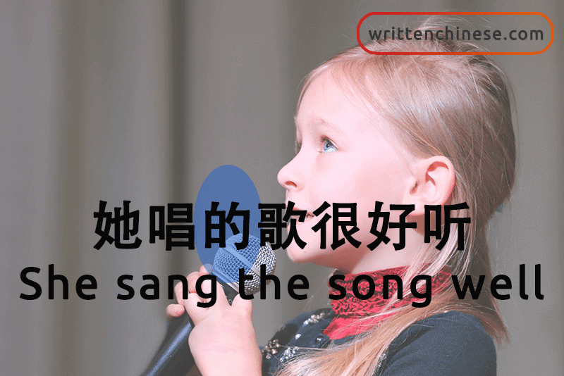 她唱的歌很好听。 (tā chàng de gē hěn hǎo tīng) She sang the song well.