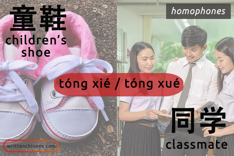 10. tóng xié / tóng xué 童鞋 children’s shoe and 同学 classmate