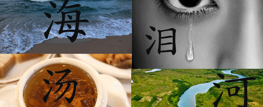Chinese characters can often be broken up into smaller pieces, or “radicals.” These radicals can give clues to a word’s meaning and pronunciation. One of the easiest radicals to spot in Chinese is 氵 三点水 (sān diǎn shuǐ), or the water radical.