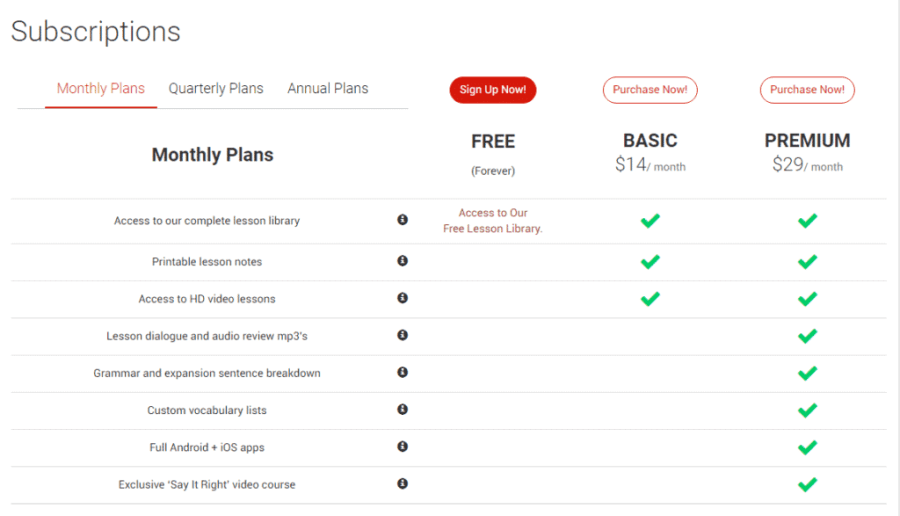 $29/per month to access the complete lesson library, printable lesson notes, HD video lessons, lesson dialogue and audio review mp3’s, grammar and expansion sentence breakdown, custom vocabulary lists, full Android + iOS apps, and exclusive ‘Say It Right’ video course.
