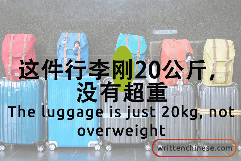 这件行李刚20公斤,没有超重。(zhè jiàn xíng li gāng 20 gōng jīn, méi yǒu chāo zhòng) The luggage is just 20kg, not overweight.