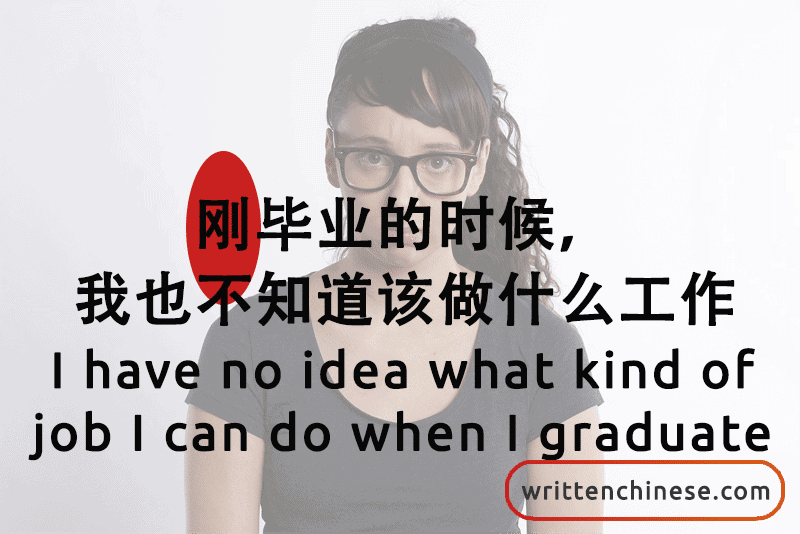 刚毕业的时候,我也不知道该做什么工作。(gāng bì yè de shí hòu, wǒ yě bù zhī dao gāi zuò shén me gōng zuò) I have no idea what kind of job I can do when I graduate.
