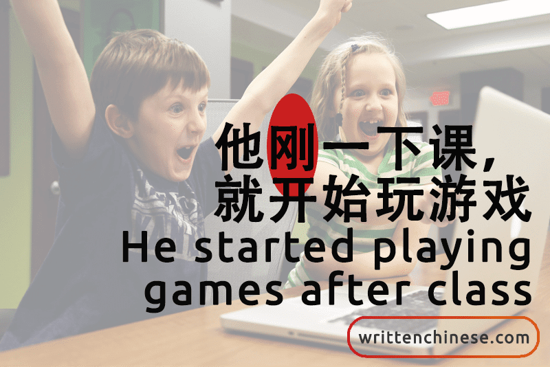 他刚一下课,就开始玩游戏。(tā gāng yī xià kè, jiù kāi shǐ wán yóu xì) He started playing games after class.