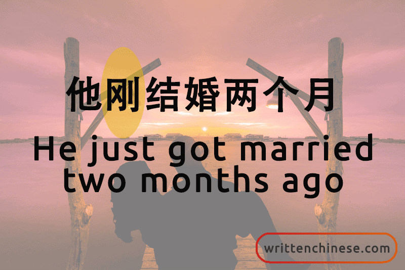 他刚结婚两个月。(tā gāng jié hūn liǎng gè yuè) He just got married two months ago.
