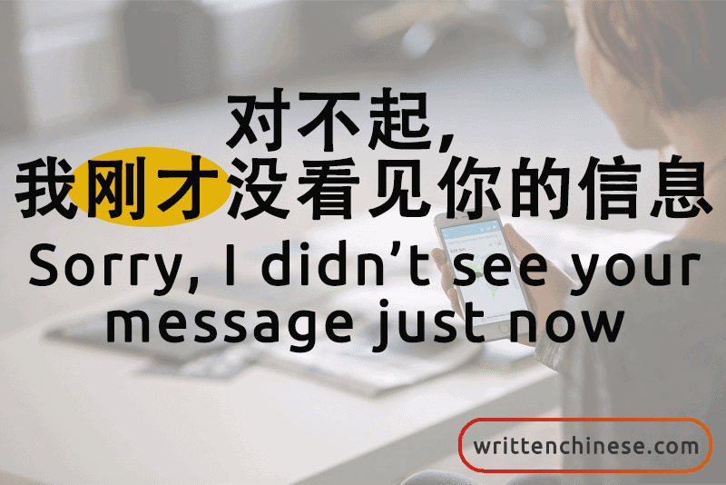 对不起,我刚才没看见你的信息。(duì bu qǐ, wǒ gāng cái méi kàn jiàn nǐ de xìn xī) Sorry, I didn’t see your message just now.