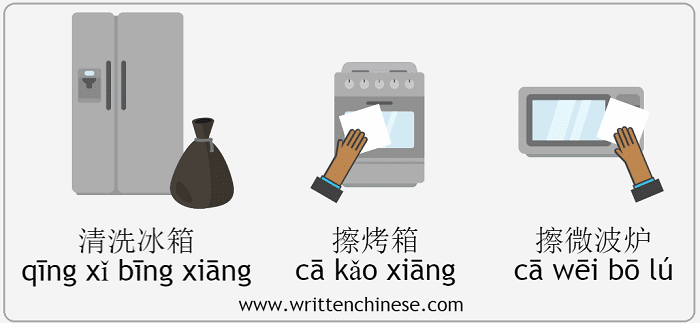 清洗冰箱 (qīng xǐ bīng xiāng) Clean out fridge