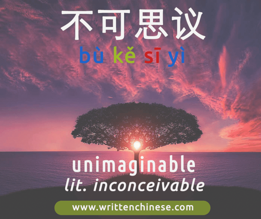 The meaning behind this Chengyu is that something is inconceivable or truly amazing. The characters literally translate to 不可 = ‘cannot’ and 思议 which means to ‘comprehend’.