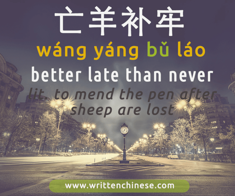 亡羊补牢 literally means to ‘repair the pen after the sheep is dead’, but its allegorical meaning is to act belatedly or like the English phrase, ‘better late than never’.
