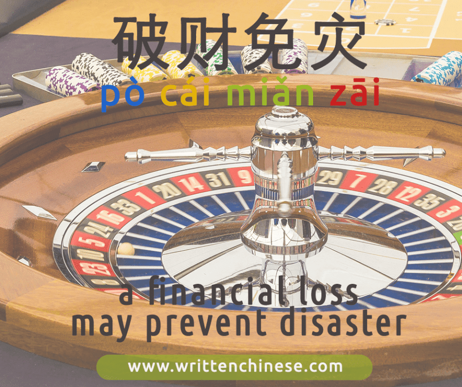 This meaning of this idiom is ‘a financial loss could prevent further disaster’ or more poetically ‘A loss of wealth is a gain of health.’ Basically, this idiom suggests that we should take solace when we lose something of value, as something worse could have happened. 破财 means to ‘lose property’, 免灾 is to ‘escape disaster’.