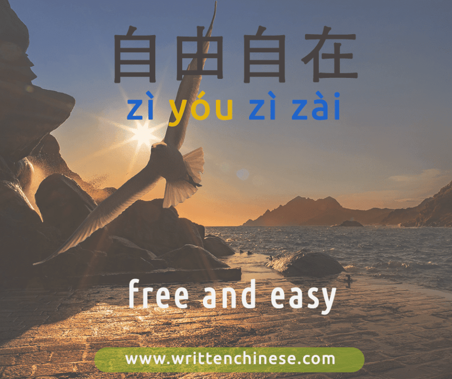 Meaning ‘to be free and easy’, this idiom translates as 自由 meaning freedom or liberty and 自在 which is to be ‘unrestrained’.