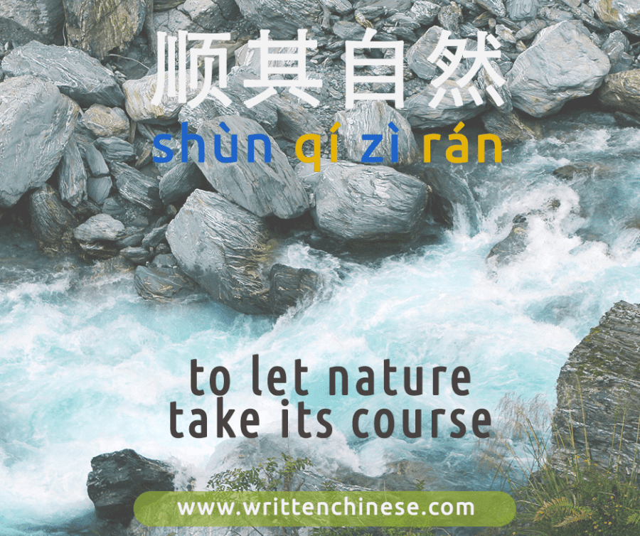 This Chengyu means ‘let nature take its course’. The first bigram 顺其 means to ‘allow something to be’, whilst 自然 means ‘natural’ or ‘naturally’. The idea behind this chengyu is that something should not be forced, but allowed to happen of its own accord, whether that be love or forging new relationships.