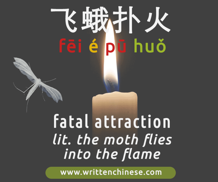 In this case, the first part of the idiom, 飞蛾扑火 means ‘a moth flies into the flame’ which refers to ‘fatal attraction’. However, the second half 自取灭亡, actually holds the real meaning, which is to ‘court disaster, or to ‘dig your own grave’.