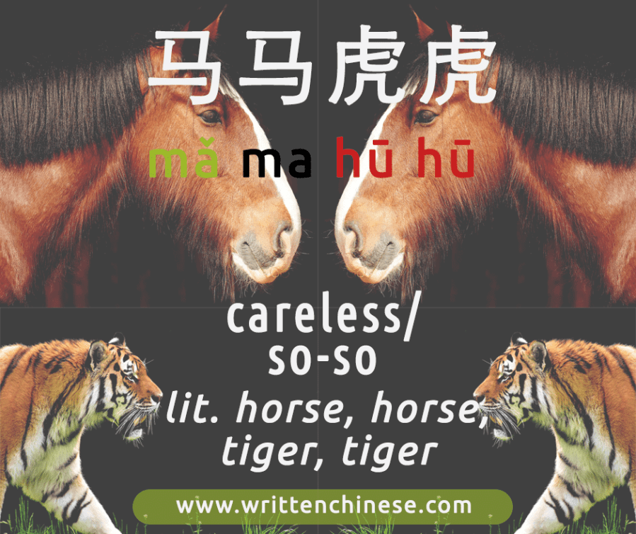 马马虎虎 is probably one of most well known Chengyu because the literal translation is ‘horse horse, tiger tiger’. This is somewhat amusing, but the most common meaning is something like ‘so-so’ or ‘not bad’.