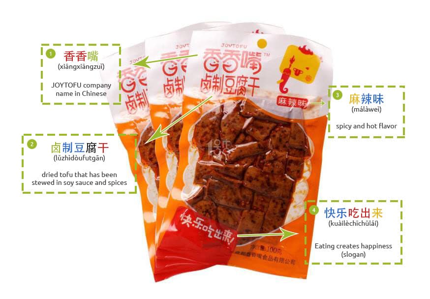 - First, we have the company name in Chinese, 香香嘴 (xiāngxiāngzuǐ) which literally means “fragrant fragrant mouth”, but it has been changed to Joytofu in English, thankfully.