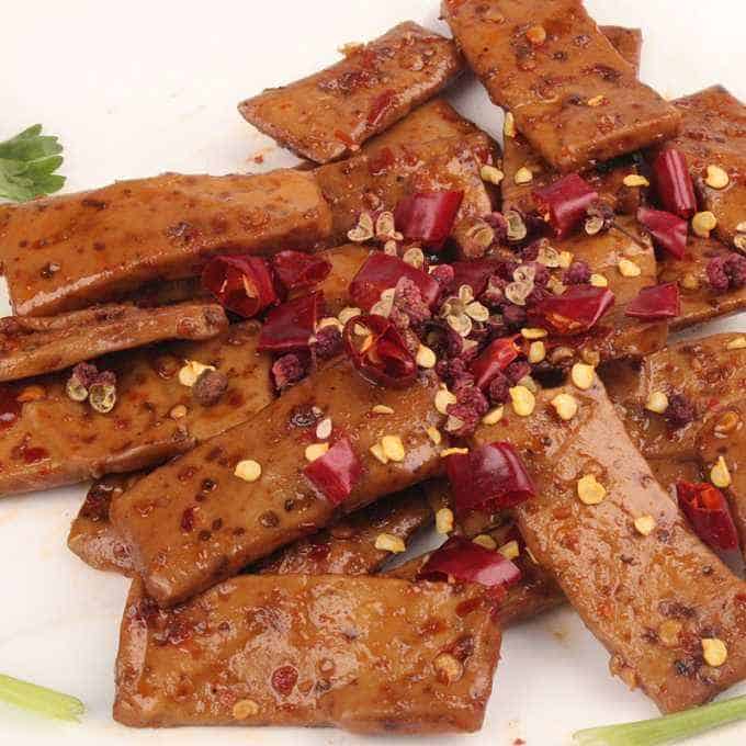 - 卤制豆腐干 (lǔ zhì dòu fu gān) is the description of the snack which translates to dried tofu that has been stewed in soy sauce and spices. Sounds tasty!