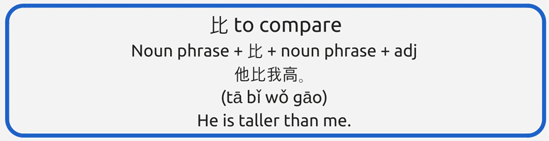 You can learn more about comparing in our article, 比 bǐ, and 没有 méi yǒu: Making Comparisons in Mandarin Chinese.