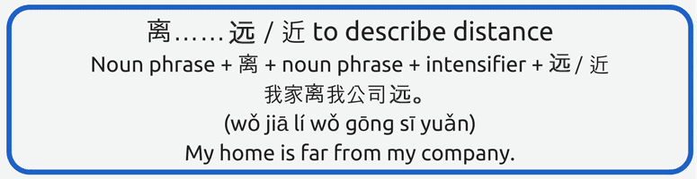 Noun phrase + 离 + noun phrase + intensifier + 远/近