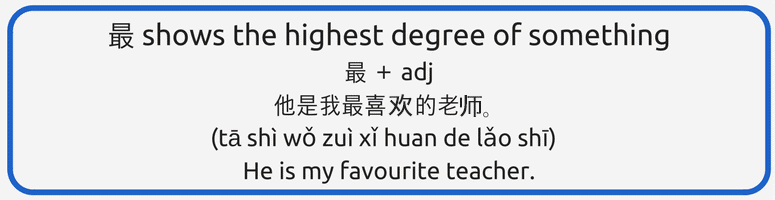 To express the highest degree, or superlative meaning use the intensifier, (zuì) meaning ‘most’
