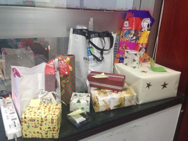 So, The Written Chinese Team decided to have a Secret Santa (神秘的圣诞老人 – shén mì de Shèng dàn Lǎo rén). Now I’m sure most of you have heard or even taken part in a Secret Santa, but some of our developers were, at first, a little reluctant to get involved! it’s hardly surprising though, I feel as though foreigners 外国人 (wài guó rén) once you take them out of their natural habitat so to speak, seem to be overly excited about every holiday or event, like you have to emphasise the point – ‘Hey, everyone. I know you don’t celebrate Christmas but because we’re so ridiculously excited about doing anything related to holidays we’re going to decorate your office and make you do a gift 礼物 (lǐ wù) swapping activity – enjoy!’