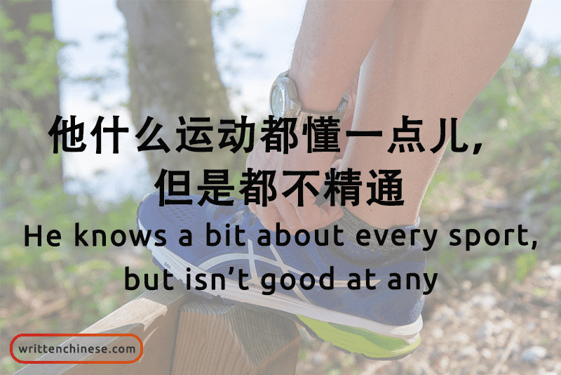 他什么运动都懂一点儿,但是都不精通。(tā shén me yùn dòng yùn dōu dǒng yī diǎnr, dàn shì dōu bù jīng tōng.) He knows a bit about every sport, but isn’t good at any.