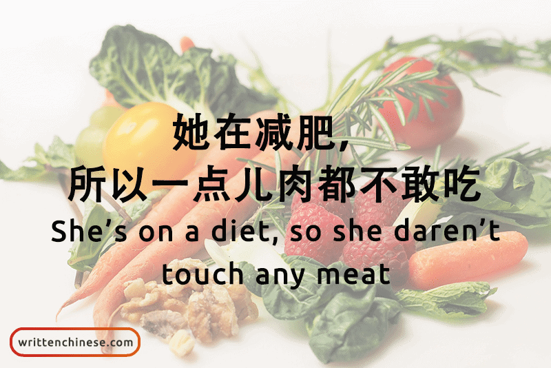 她在减肥,所以一点儿肉都不敢吃。(tā zài jiǎn féi, suǒ yǐ yī diǎnr ròu dōu bù gǎn chī.) She’s on a diet, so she daren’t eat any meat.