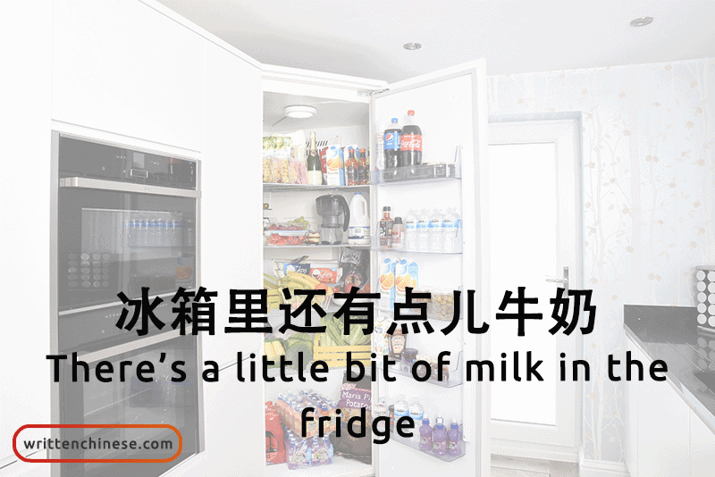 冰箱里还有点儿牛奶。(bīng xiāng lǐ hái yǒu diǎnr niú nǎi.) There’s a little bit of milk in the fridge.