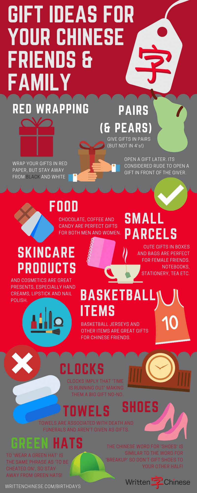 Since Chinese culture is packed with superstitions, it’s also good to know what NOT to buy as a gift (not just for a birthday gift).