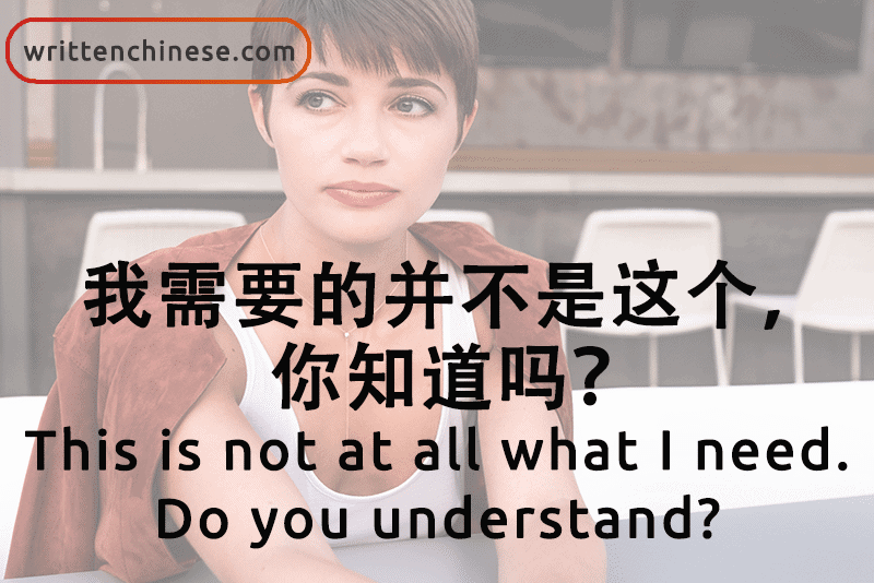 我需要的并不是这个,你知道吗? (wǒ xū yào de bìng bù shì zhè ge, nǐ zhī dao ma?) This is not at all what I need. Do you understand?