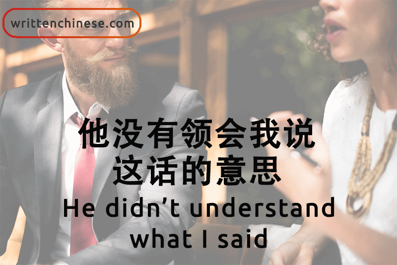 他没有领会我说这话的意思。(tā méi yǒu lǐng huì wǒ shuō zhè huà de yì si.) He did not understand what I said.